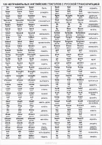 Неправильные глаголы английского языка - это неотъемлемая часть английской грамматики, которые необходимо знать для того, чтобы рассказать о прошлых событиях, новостях. Глаголы в английском прошедшем времени образуются с помощью очень простого правила: к основной форме глагола добавляется окончание -ed (e.g. to walk -walked). Но есть глаголы, которые не подчиняются этому правилу - так называемые irregular verbs (to go - went). Многие из них часто употребляются в английской речи и поэтому знать их просто необходимо. Единственный способ запомнить неправильные глаголы -это заучить их. Данная таблица неправильных глаголов английского с переводом, произношением и транскрипцией (120 глаголов) поможет Вам в этом. Это и многое другое вы найдете в книге 120 неправильных английских глаголов с русской транскрипцией (Н. В. Ефимова)