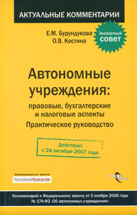 | Полное название книги | О. В. Костина, Е. М. Бурундукова Автономные учреждения. Правовые, бухгалтерские и налоговые аспекты |