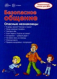 Тематический материал "Безопасное общение" в виде ширмочки представляет собой информацию для детей и родителей: - В дверь звонок? Смотри в глазок! - Когда зазвонил телефон… - Смотри в оба - Ключ береги. И роток на замок! - Осторожно - "добрый дядя" - Не бойся звать на помощь - Опасные места - Правила находчивых "потеряшек" Это и многое другое вы найдете в книге Безопасное общение. Тематический уголок для ДОУ (С. Н. Савушкин)