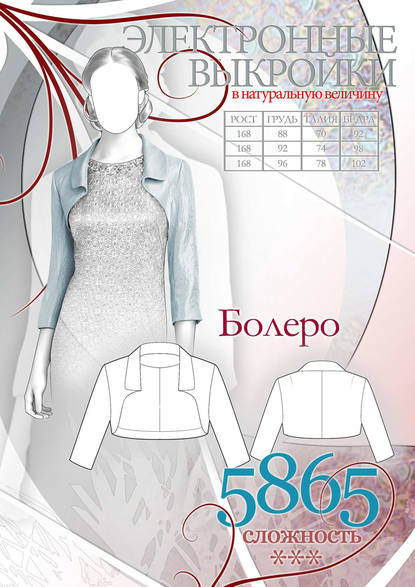 В книге даны выкройки модели на три размера в натуральную величину с припусками на швы. Размеры 168-88-94, 168-92-98, 168-96-102. Выкройки даны в двух вариантах для печати на листах формата А4 и А3. В книге приведено описание отшива модели, рекомендации по печати.