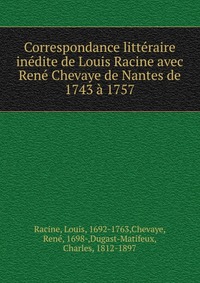 Correspondance litteraire inedite de Louis Racine avec Rene Chevaye de Nantes de 1743 a 1757 Воспроизведено в оригинальной авторской орфографии издания 1858 года (издательство "Paris : L. Potier"). Это и многое другое вы найдете в книге Correspondance litteraire inedite de Louis Racine (Louis Racine)