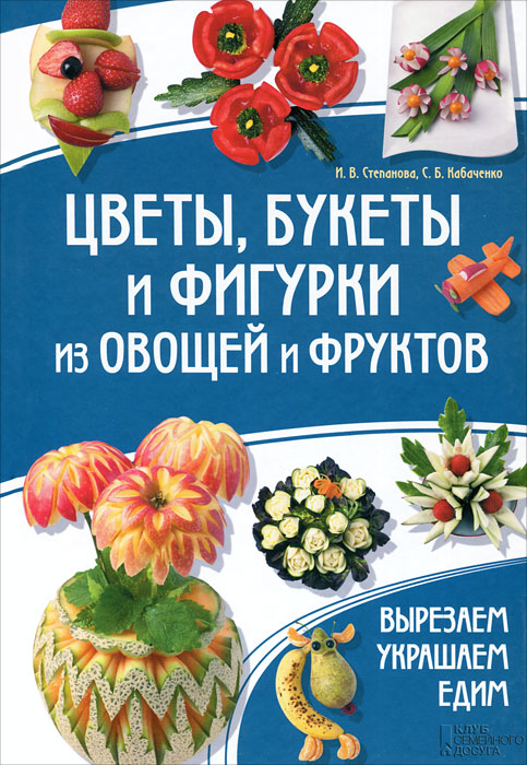 | Полное название книги | С. Б. Кабаченко, И. В. Степанова Цветы, букеты и фигурки из овощей и фруктов. Вырезаем. Украшаем. Едим |