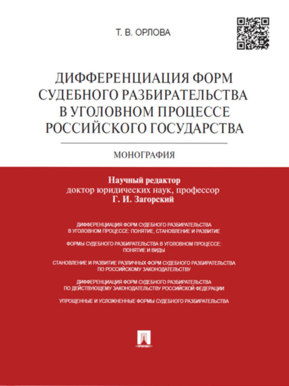 | Полное название книги | Татьяна Владимировна Орлова, Геннадий Ильич Загорский Дифференциация форм судебного разбирательства в уголовном процессе Российского государства. Монография |