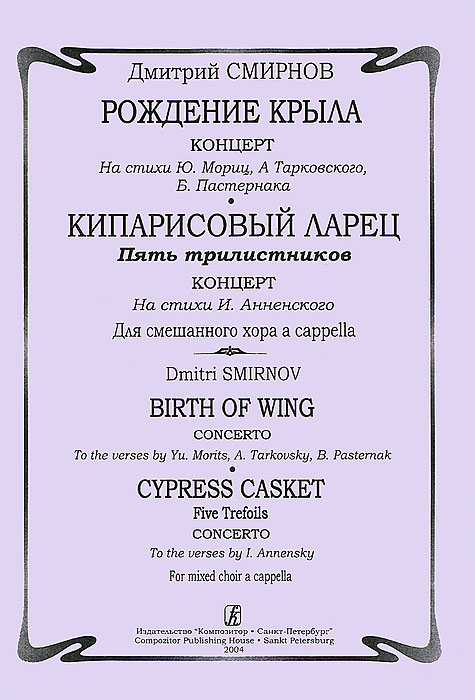 | Полное название книги | Дмитрий Смирнов Дмитрий Смирнов. Концерт "Рождение крыла". Концерт "Кипарисовый ларец. Пять трилистников". Для смешанного хора a cappella |
