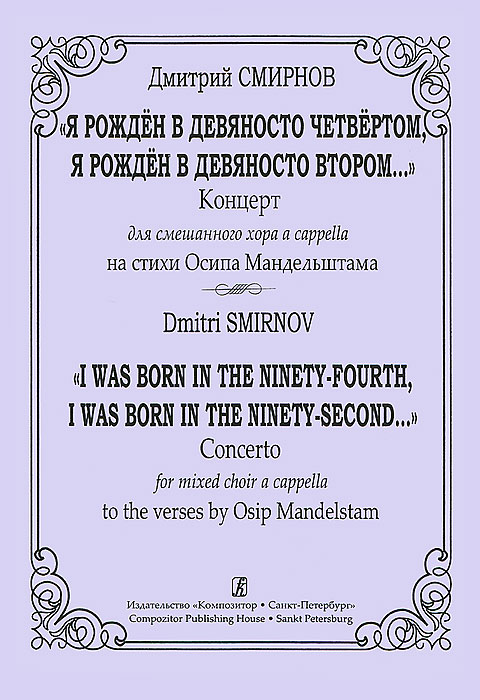 | Полное название книги | Дмитрий Смирнов Дмитрий Смирнов. "Я рожден в девяносто четвертом, я рожден в девяносто втором...". Концерт для смешанного хора a cappella на стихи Осипа Мандельштама |