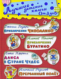 | Полное название книги | Алексей Толстой, Анатолий Резников, Льюис Кэрролл, Джанни Родари Джанни Родари. Приключения Чиполлино. Алексей Толстой. Приключения Буратино. Льюис Кэрролл. Алиса в Стране Чудес. Анатолий Резников. Прерванный полет |