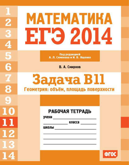 | Полное название книги | Владимир Алексеевич Смирнов ЕГЭ 2014. Математика. Задача B11. Геометрия: объем, площадь поверхности. Рабочая тетрадь |