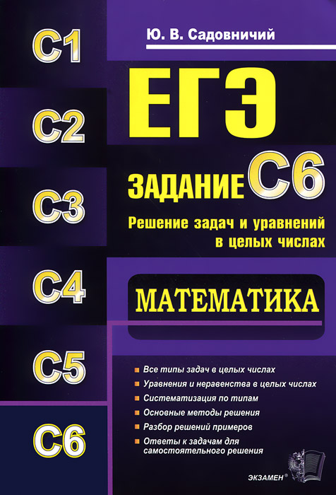 | Полное название книги | Ю. В. Садовничий ЕГЭ. ЗАДАНИЕ С6. МАТЕМАТИКА. РЕШЕНИЕ ЗАДАЧ И УРАВНЕНИЙ В ЦЕЛЫХ ЧИСЛАХ |