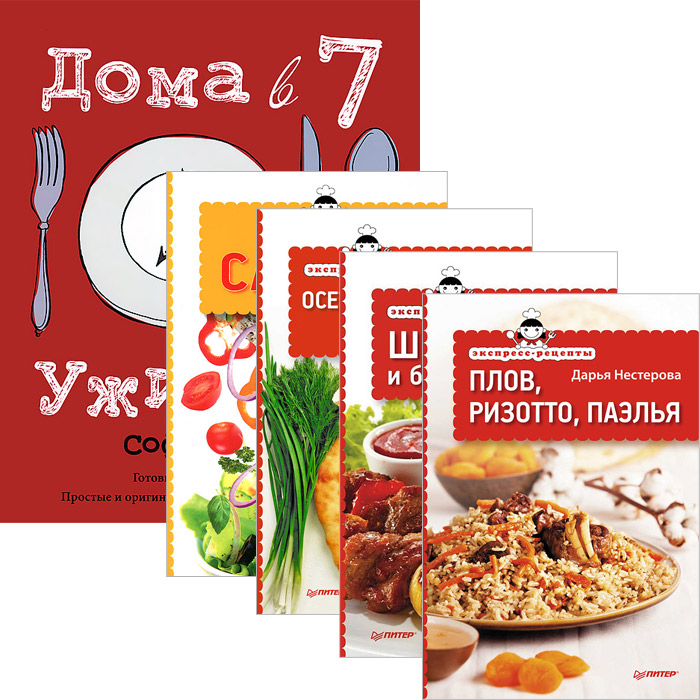 | Полное название книги | Дарья Нестерова, Елена Товкун, Софи Райт Экспресс-рецепты. Плов. Шашлыки. Салаты. Осетинские пироги. Дома в 7, ужин в 8 (комплект из 5 книг) |