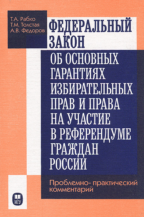 | Полное название книги | Т. М. Толстая, Т. А. Рабко, А. В. Федоров Федеральный закон об основных гарантиях избирательных прав и права на участие в референдуме граждан России. Проблемно-практический комментарий |