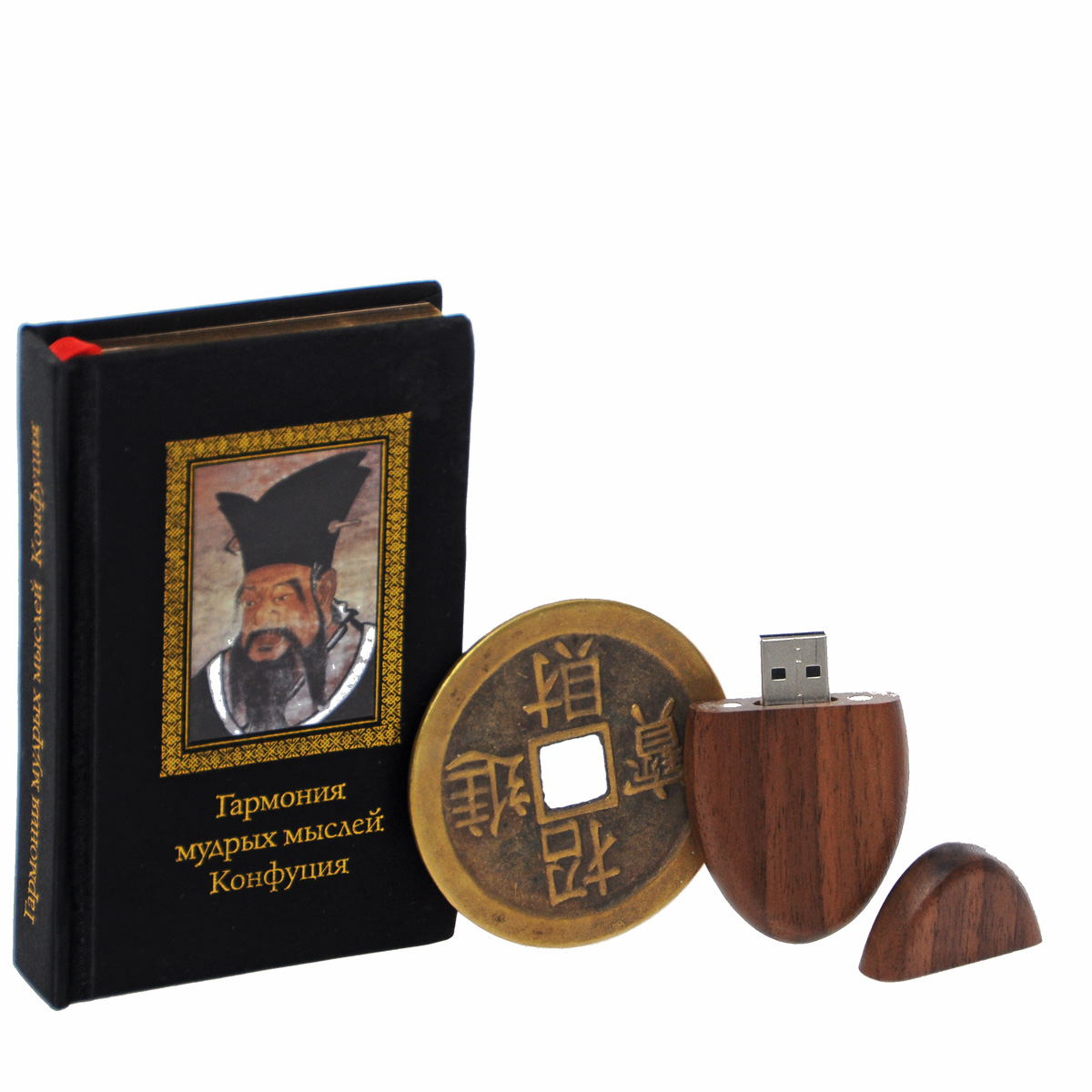 В наборе USB-накопитель (8 гигабайт) в стильном овальном деревянном корпусе и медная монета оберег, которая гармонизирует мысли человека, успокаивает его, настраивает на спокойный созерцательный лад, а также приносит удачу в финансовых делах.