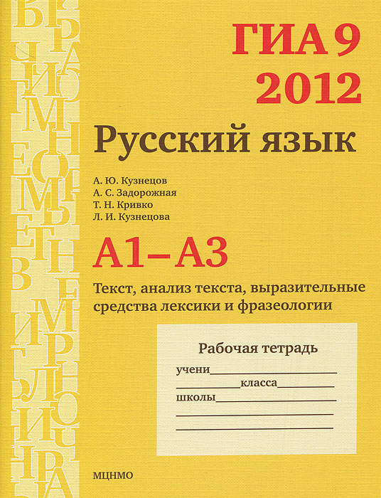 | Полное название книги | А. С. Задорожная, Л. И. Кузнецова, А. Ю. Кузнецов, Т. Н. Кривко ГИА 2012. Русский язык. 9 класс. А1-А3. Текст, анализ текста, выразительные средства лексики и фразеологии. Рабочая тетрадь |