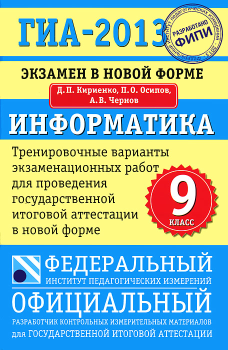 | Полное название книги | П. О. Осипов, Д. П. Кириенко, А. В. Чернов ГИА-2013. Экзамен в новой форме. Информатика. 9 класс |
