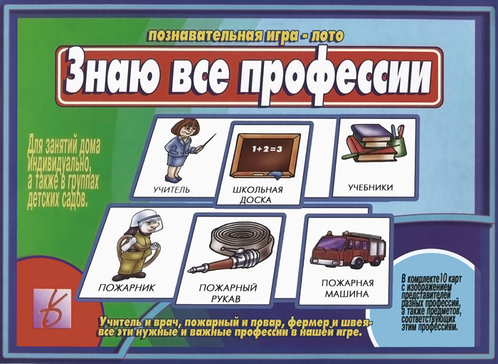 Для занятий в группах детских садов и индивидуально. Это и многое другое вы найдете в книге Игра "Знаю все профессии" Д-215 (а)