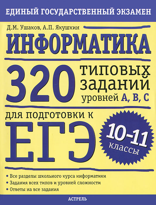 | Полное название книги | А. П. Якушкин, Д. М. Ушаков Информатика. 320 типовых тестовых заданий уровней А, В, С для подготовки к ЕГЭ. 10-11 классы |
