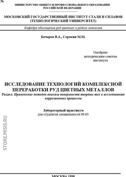 | Полное название книги | Владимир Алексеевич Бочаров, Михаил Михайлович Сорокин Исследование технологий комплексной переработки руд цветных металлов. Применение методов анализа поверхности твердых тел к исследованию коррозионных процессов |
