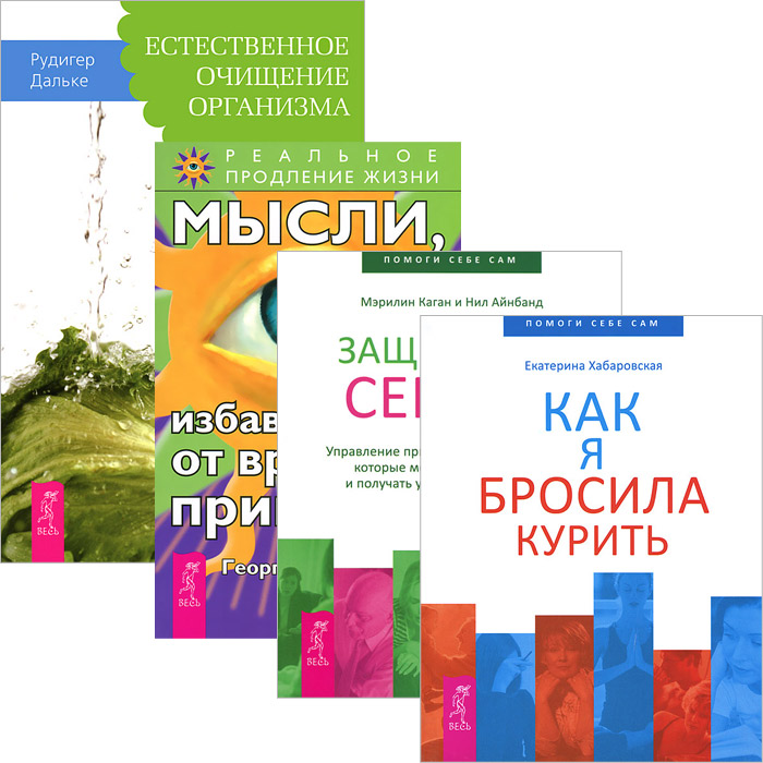 | Полное название книги | Екатерина Хабаровская, Георгий Сытин, Мэрилин Каган и Нил Айнбанд, Рудигер Дальке Как я бросила курить. Мысли, избавляющие от вредных привычек. Естественное очищение организма. Защитники сердца (комплект из 4 книг) |
