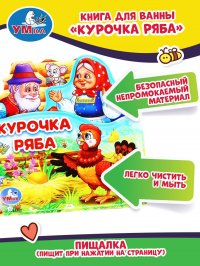 Книжка-пищалка с закладками для ванны «Курочка Ряба» ТМ «УМка» – превратите купание в весёлую игру:- нажимаем на книжку – она пищит- 3 закладки- яркие иллюстрации- русская народная сказка- безопасный непромокаемый материал- легко чистить и мытьКнижку можно использовать во время кормления и прогулки.Игра с книжкой ТМ «УМка» способствует развитию:- слухового и зрительного восприятия- мелкой моторики- внимания- памяти- фантазииОбъём: 8 стр. Формат книги: 140 х140 мм.Материал: полимер.Рекомендуем для детей с рождения. Это и многое другое вы найдете в книге Книжка-пищалка с закладками для ванны Курочка Ряба (К. Хомякова)