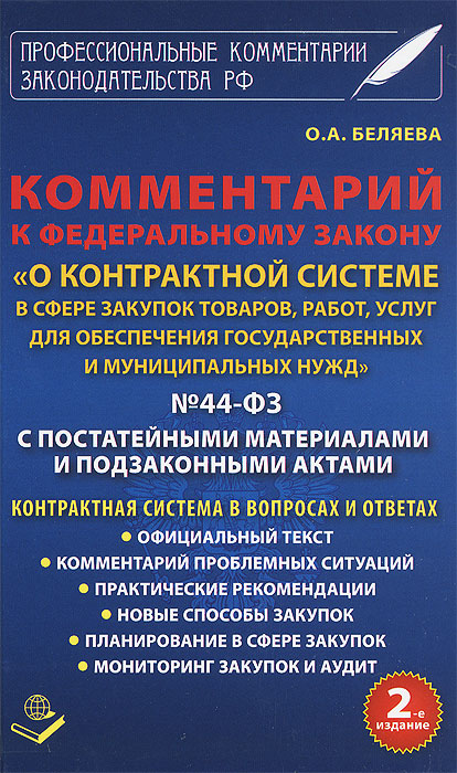 | Полное название книги | О. А. Беляева Комментарий к федеральному закону "О контрактной системе в сфере закупок товаров, работ, услуг для обеспечения государственных и муниципальных нужд" №44-ФЗ. С постатейными материала |