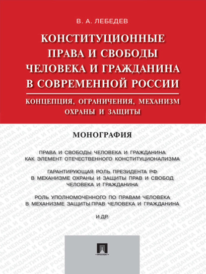 | Полное название книги | Валериан Алексеевич Лебедев Конституционные права и свободы человека и гражданина в современной России: концепция, ограничения, механизм охраны и защиты. Монография |