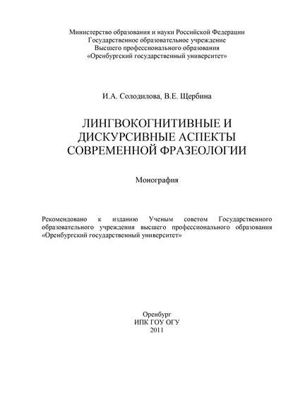 | Полное название книги | Валентина Евгеньевна Щербина, И. А. Солодилова Лингвокогнитивные и дискурсивные аспекты современной фразеологии |