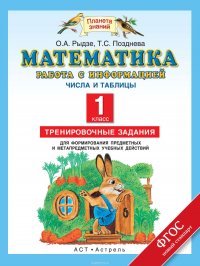 | Полное название книги | Рыдзе Оксана Анатольевна, Позднева Татьяна Сергеевна Математика. Работа с информацией. Числа и таблицы. Тренировочные задания для формирования предметных и метапредметных учебных действий. 1 класс |