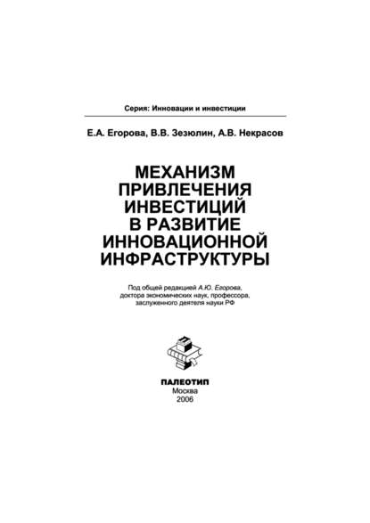 | Полное название книги | Елена Анатольевна Егорова, Анатолий Валентинович Некрасов, Владислав Валерьевич Зезюлин Механизм привлечения инвестиций в развитие инновационной инфраструктуры |