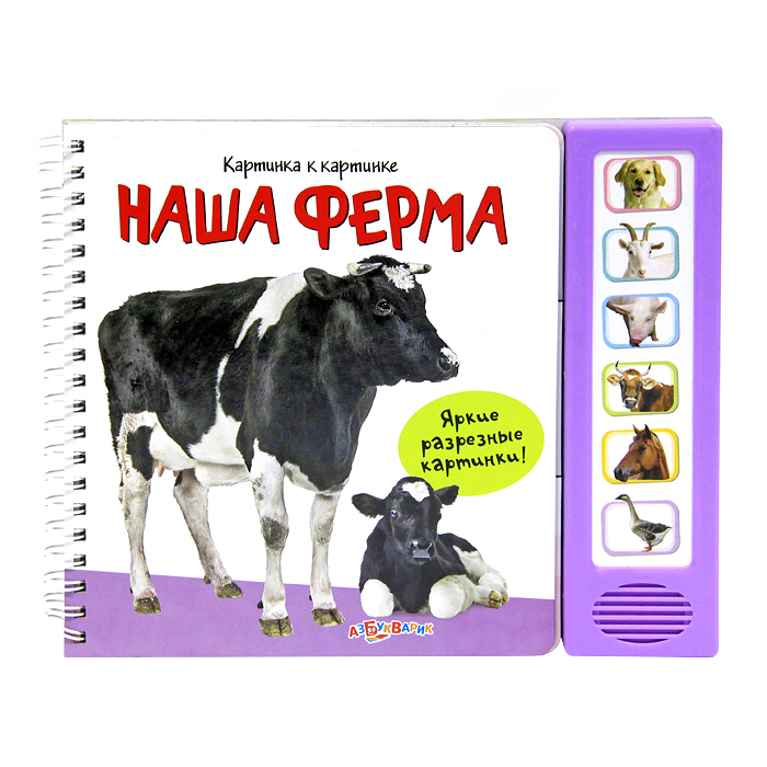 Перелистывая разрезные странички этой книжки, малыш сам составит яркие фотографии домашних животных. А, нажимая на кнопочки, послушает забавные стихи и настоящие голоса обитателей фермы.