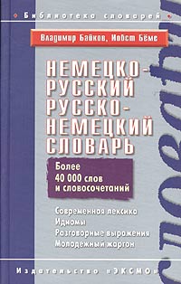 | Полное название книги | Владимир Байков, Иобст Беме Немецко-русский, русско-немецкий словарь. Современная лексика. Идиомы. Разговорные выражения. Молодежный жаргон / Deutsch-Russisches Russisch-Deutsches Worterbuch. Aktueller Wortschatz, Idiom |
