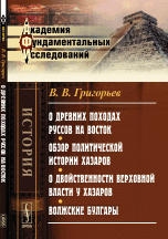 | Полное название книги | В. В. Григорьев О древних походах Руссов на Восток. Обзор политической истории Хазаров. О двойственности верховной власти у Хазаров. Волжские Булгары |