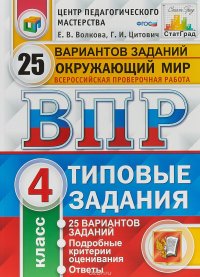 | Полное название книги | Е. В. Волкова, Г. И. Цитович Окружающий мир. 4 класс. Всероссийская проверочная работа. 25 вариантов. Типовые задания |
