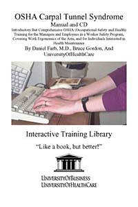 This title is part of the UniversityOfHealthCare/ UniversityOfBusiness Interactive Training Library, which offers authoritative, clearly written material in an interactive form for better comprehension and documentation of completion. The manual accompanying the CD provides a summary of the major points of the CD in a handy format. With an increasingly high-tech work force, the incidence of carpal tunnel syndrome has increased. OSHA Carpal Tunnel Syndrome teaches workers and managers what they need to know about carpal tunnel syndrome, how to prevent it, and how to treat it. It is illustrated with many photos of exercises and positions. It is suitable for OSHA training. Estimated time: 2-4 hours. 180 pages on CD. 22 pages in the manual. You must have Internet Explorer 4.0 or higher running on your computer. Supported operating systems are Windows 95, 98, 98 SE, ME, 2000, or XP. You will need Internet access to e-mail us your unique key and receive a password key. License is for one user on one computer. An additional computer owned by the same user will generally be approved at the discretion of the publisher. Это и многое другое вы найдете в книге OSHA Carpal Tunnel Syndrome Manual and CD, Introductory But Comprehensive OSHA (Occupational Safety and Health) Training for the Managers and Employees in a Worker Safety Program, Covering Wo (Daniel, MD Farb, Bruce Gordon, Daniel Farb)