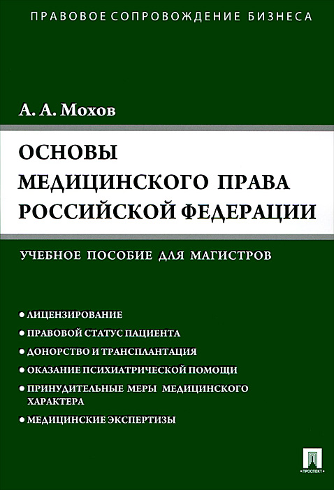 | Полное название книги | А. А. Мохов Основы медицинского права РФ. Правовые основы медицинской и фармацевтической деятельности в РФ. Учебное пособие |