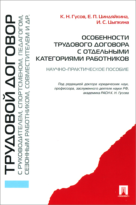 | Полное название книги | К. Н. Гусов, И. С. Цыпкина, Е. П. Циндяйкина Особенности трудового договора с отдельными категориями работников. Научно-практическое пособие |