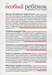 С 1998 года выходит в свет авторский периодический сборник РБОО «Центра лечебной педагогики» - «Особый ребенок». В десятом выпуске опубликованы статьи ведущих специалистов Центра и его партнерских организаций, представляющие разные формы работы с детьми и взрослыми, - ранняя помощь, групповые и индивидуальные занятия с дошкольниками, поддержка школьного обучения, подготовка к самостоятельному проживанию взрослых с психическими нарушениями. .Издание адресовано специалистам (психологам, педагогам, де-фектологам и др.), работающим с детьми и взрослыми с различными нарушениями развития, и всем, кто интересуется данной проблематикой. Это и многое другое вы найдете в книге Особый ребенок. Исследования и опыт помощи. Научно-практический сборник. Выпуск 10 (Константинова И.С.,ред.)