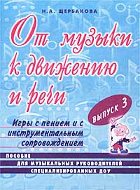 | Полное название книги | Н. А. Щербакова От музыки к движению и речи. Выпуск 3. Игры с пением и с инструментальным сопровождением. Пособие для музыкальных руководителей специализированных ДОУ |