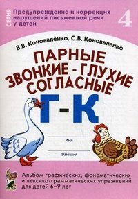 | Полное название книги | С. В. Коноваленко, В. В. Коноваленко Парные звонкие - глухие согласные Г - К. Альбом графических, фонематических и лексико-грамматических упражнений для детей 6-9 лет |