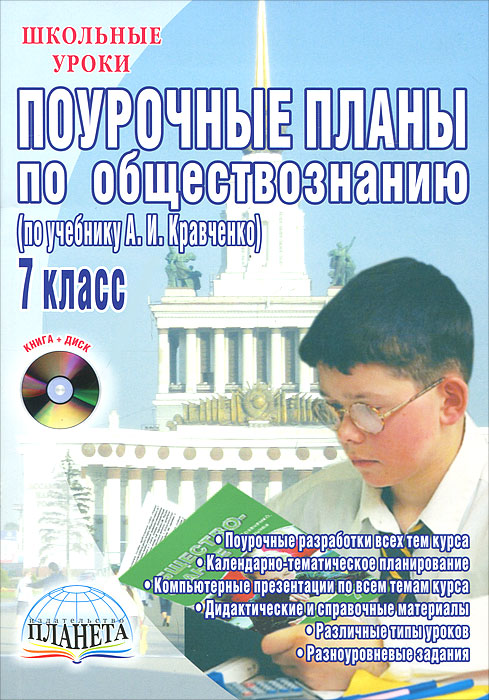 th >Настоящее пособие представляет собой сборник методических разработок уроков по курсу "Обществознание" за 7 класс. Методическое пособие содержит примерное планирование курса "Обществознание" в 7 классе, которое соответствует учебнику "Обществознание" автора А.И.Кравченко (М.: Русское слово, 2009). В сборнике даны различные методики проведения уроков обществознания, справочные и дополнительные материалы, тесты, разноуровневые задания для групповой и индивидуальной работы. Предлагаемые поурочные разработки помогут учителю сделать изучение курса "Обществознание" интересным и глубоким. Пособие дополнено электронным приложением (CD-диском), которое содержит презентации к каждому уроку, выполненные в программе Power Point. Предназначено для учителей обществознания, студентов педагогических вузов, слушателей ИПК и ФПК. Это и многое другое вы найдете в книге Поурочные планы по обществознанию. 7 класс (+ CD-ROM) (Елена Сорокина)