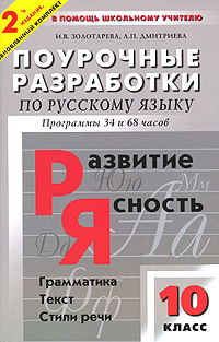 | Полное название книги | И. В. Золотарева, Л. П. Дмитриева Поурочные разработки по русскому языку. 10 класс. Программы 34 и 68 часов |