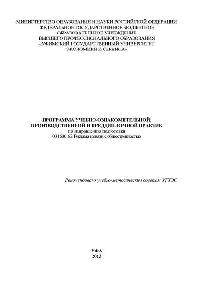 | Полное название книги | Коллектив авторов, Программа учебно-ознакомительной, производственной и преддипломной практик по направлению подготовки 031600.62 Реклама и связи с общественностью |