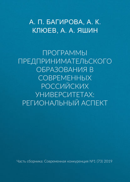 Подробная информация о книге «Программы предпринимательского образования в современных российских университетах: региональный аспект А. А. Яшин, А. К. Клюев, Анна Петровна Багирова». Сайт не предоставляет возможности читать онлайн или скачать бесплатно книгу «Программы предпринимательского образования в современных российских университетах: региональный аспект А. А. Яшин, А. К. Клюев, Анна Петровна Багирова».
