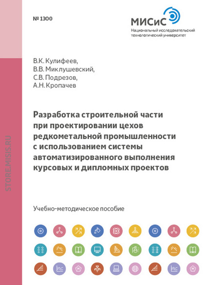 | Полное название книги | Владимир Константинович Кулифеев, Андрей Николаевич Кропачев, Владимир Владимирович Миклушевский, Сергей Викторович Подрезов Разработка строительной части при проектировании цехов редкометальной промышленности с использованием системы автоматизированного выполнения курсовых и дипломных проектов |