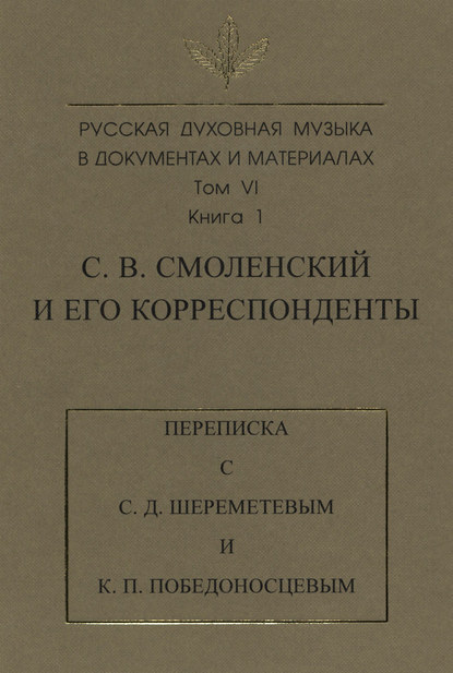 | Полное название книги | А. А. Наумов, Русская духовная музыка в документах и материалах. Том 6. Книга 1: С. В. Смоленский и его корреспонденты. Переписка с С. Д. Шереметевым и К. П. Победоносцевым |