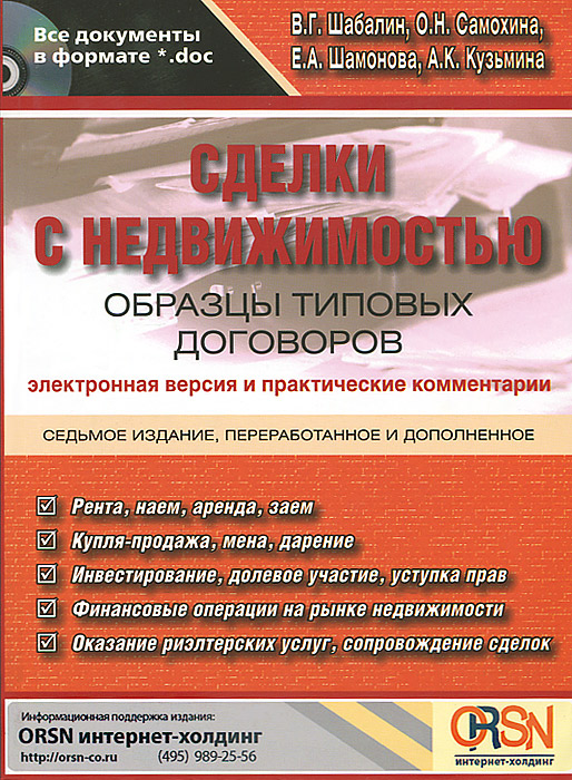 | Полное название книги | О. Н. Самохина, В. Г. Шабалин, Е. А. Шамонова, А. К. Кузьмина Сделки с недвижимостью. Образцы типовых договоров. Электронная версия и практические комментарии (+ CD-ROM) |
