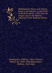 Shakespeares Venus and Adonis. Being a reproduction in facsimile of the first edition, 1593, from the unique copy in the Malone collection in the Bodleian library. Воспроизведено в оригинальной авторской орфографии издания 1905 года (издательство "Oxford, Clarendon Press"). Это и многое другое вы найдете в книге Shakespeares Venus and Adonis (William Shakespeare)
