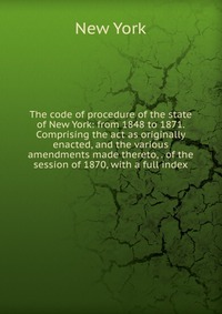 | Полное название книги | New York The code of procedure of the state of New York: from 1848 to 1871. Comprising the act as originally enacted, and the various amendments made thereto, . of the session of 1870, with a full ind |