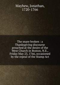 | Полное название книги | Jonathan Mayhew The snare broken : a Thanksgiving discourse preached at the desire of the West Church in Boston, N.E., Friday May 23, 1766, occasioned by the repeal of the Stamp Act |