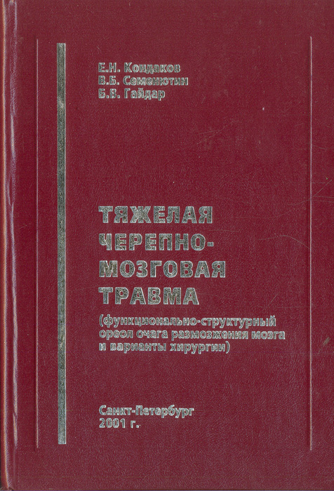 | Полное название книги | Е. Н. Кондаков, В. Б. Семенютин, Б. В. Гайдар Тяжелая черепно-мозговая травма. Функционально-структурный ореол очага размозжения мозга и варианты хирургии |