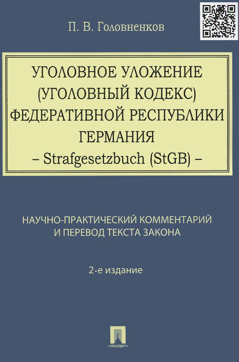 Книга предназначена не только для практикующих юристов и правоведов, но также для всех, кто в силу своей профессиональной деятельности или учебы интересуется уголовным правом Федеративной Республики Германия. Это и многое другое вы найдете в книге Уголовное уложение (Уголовный кодекс) ФРГ: научно-практический комментарий и перевод текста закона.-2-е изд.-М.:Проспект,2015 (А. И. Рарог, П. В. Головненков)