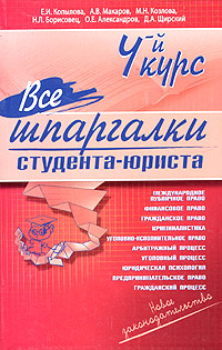 | Полное название книги | Д. А. Щирский, М. Н. Козлова, О. Е. Александров, Е. И. Капылова, Н. Л. Борисовец, А. В. Макаров Все шпаргалки студента-юриста. 4-й курс |